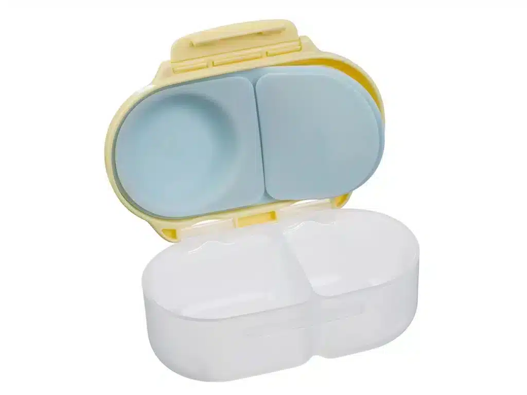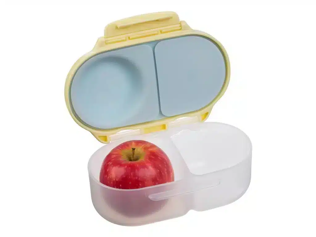 Idéale pour les lunchs à l’école, les pique-niques en famille ou les goûters à la crèche, cette snackbox s’emporte partout. Glissez-la dans le sac à dos de votre enfant, elle ne prend pas trop de place et garde les aliments bien organisés. Après usage, un passage au lave-vaisselle (panier supérieur) suffit pour un nettoyage rapide et hygiénique. Vous pouvez aussi la laver à la main avec une éponge douce. Elle est compatible avec les aliments solides et semi-liquides, comme les compotes ou les yaourts épais.