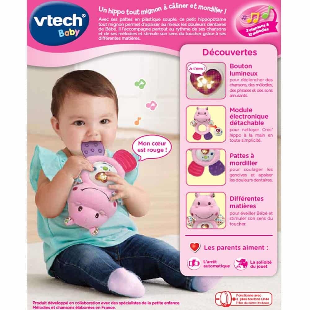 Quand bébé commence à tout porter à la bouche, c’est le signe que ses premières dents pointent. Le VTech Croc’hippo rose devient alors son meilleur allié. Ce petit hippopotame tout doux est conçu pour apaiser les gencives sensibles tout en offrant un moment de jeu rassurant. Au Maroc, les mamans cherchent des solutions à la fois efficaces et ludiques pour soulager les poussées dentaires. Ce compagnon de dentition combine parfaitement bien-être et éveil sensoriel.